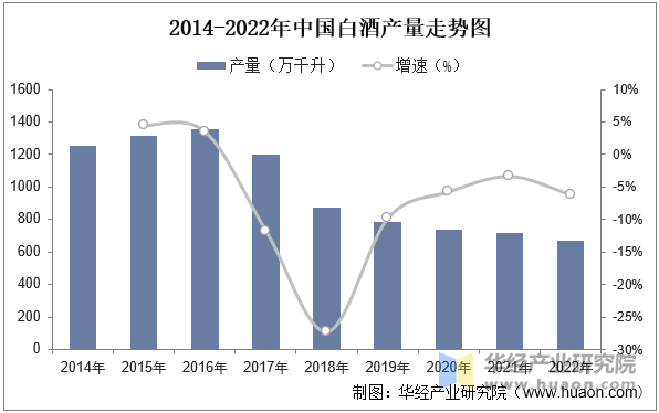 2017年该时段我国提出由制制大国向制制强国改变的总方针,连系此时供给侧相关政策屡次出台,各处所逐渐清退掉队产能,同时叠加高端和次高端产物横向挤压中低端市场需求,全体需求渐趋饱和布景下,白酒总产量持续下滑,数据显示,2022年中国白酒产量671。2万千升,同比2021年下降5。6%。