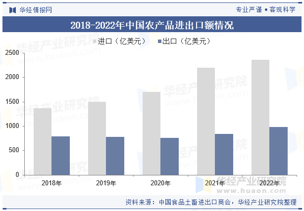 近年来,我国农产物商业总额呈上升趋向,特别农产物进口额上涨趋向更为显著。正在疫情影响最为严沉的2022年,农产物商业照旧连结快速增加态势。2022年,我国农产物进出口总额3343。2亿美元,同比增加9。9%,此中出口982。6亿美元,占我国外贸出口总额2。7%;进口2360。6亿美元,同比增加7。4%,占我国外贸进口总额8。7%;商业逆差1378亿美元,比上年同期扩大1。7%。