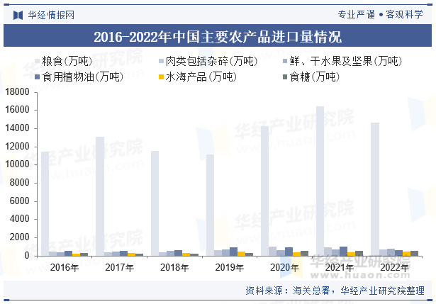 2022年我国农产物进口次要以粮食为从,按照海关总署的统计口径,我国粮食进口量为14687万吨,同比下降10。7%。鲜、干生果及坚果、食用动物油、水海产物、食糖进口量别离为753万吨、648万吨、527万吨。