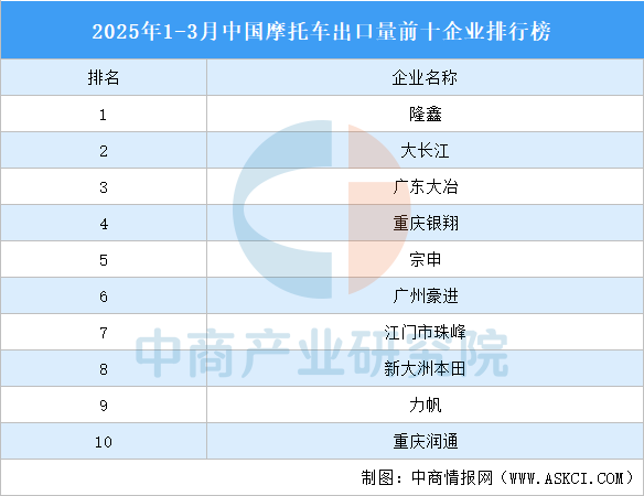 中商谍报网讯:一季度,摩托车整车出口量292。74万辆,同比增加27。59%。摩托车出口量前十家企业共出口181。55万辆,占摩托车出口总量的62%。此中,隆鑫出口量迫近40万辆位居榜首,广东大冶排名第二和第三,申、广州豪进、江门市珠峰、新大洲本田、力帆、沉庆润通进入前十,顺次排名第4-10名。