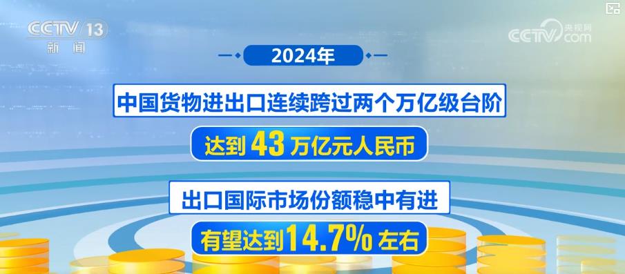 2024年,中国货色进出口持续跨过两个万亿级台阶,达到43万亿元人平易近币。出口国际市场份额稳中有进,无望达到14。7%摆布。此中平易近营企业占比跨越八成。同时,“立异”成为中国外贸的明显底色,通过智能化、数字化、绿色化的持续转型升级,中国产物的立异力获得了全球消费者的青睐。中国新业态的潜力仍正在持续,“鼠标一点,跨境电商为全球消费者创制了更为便当的购物体验,也支持其持续数年实现两位数增加。